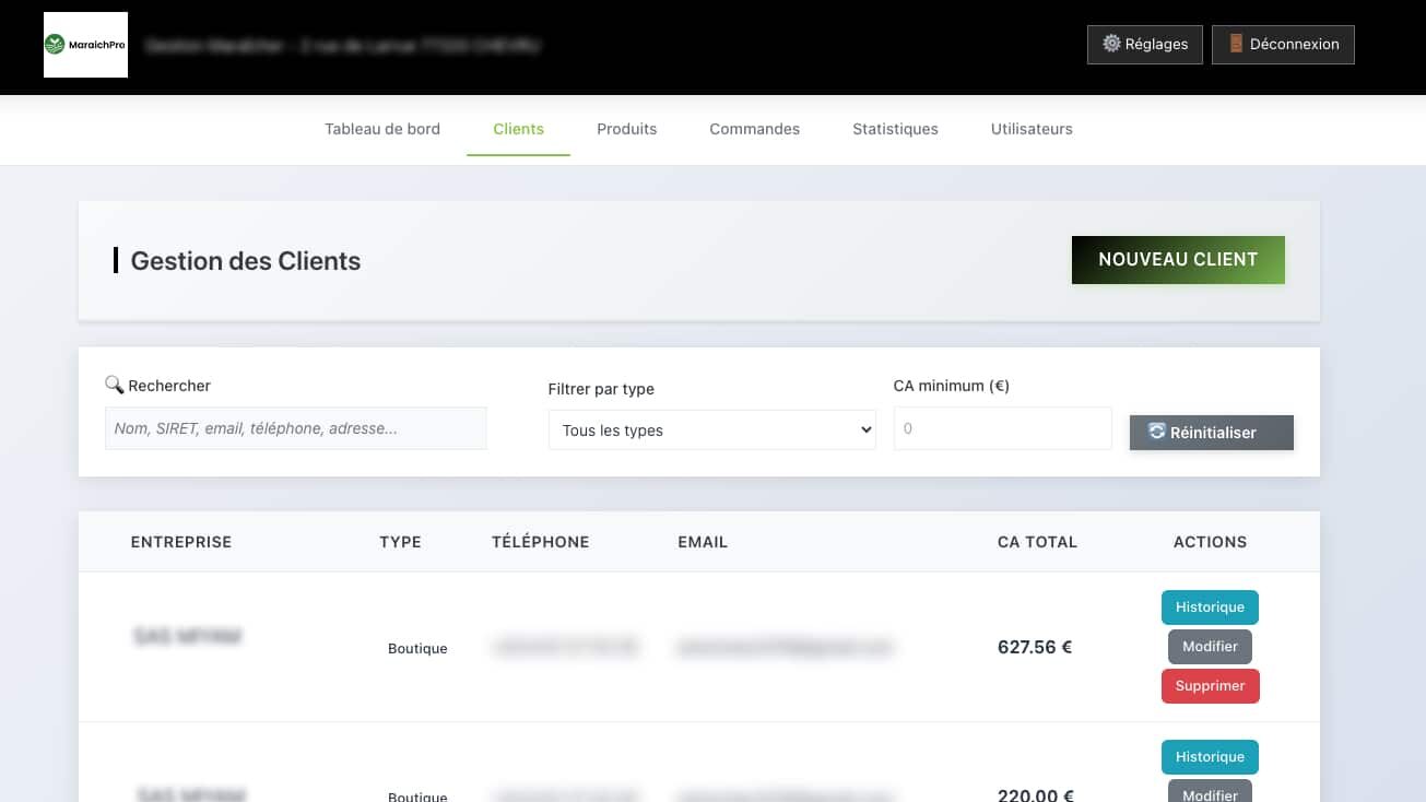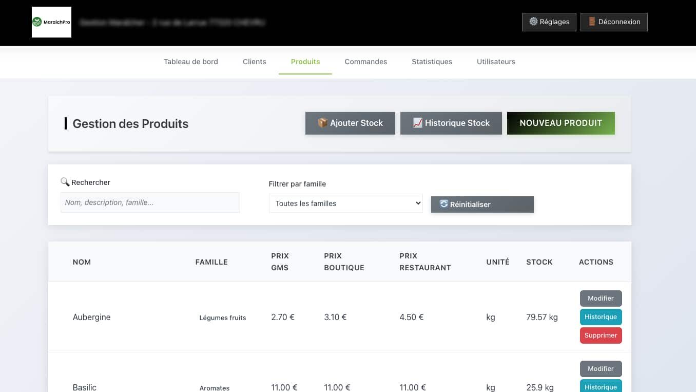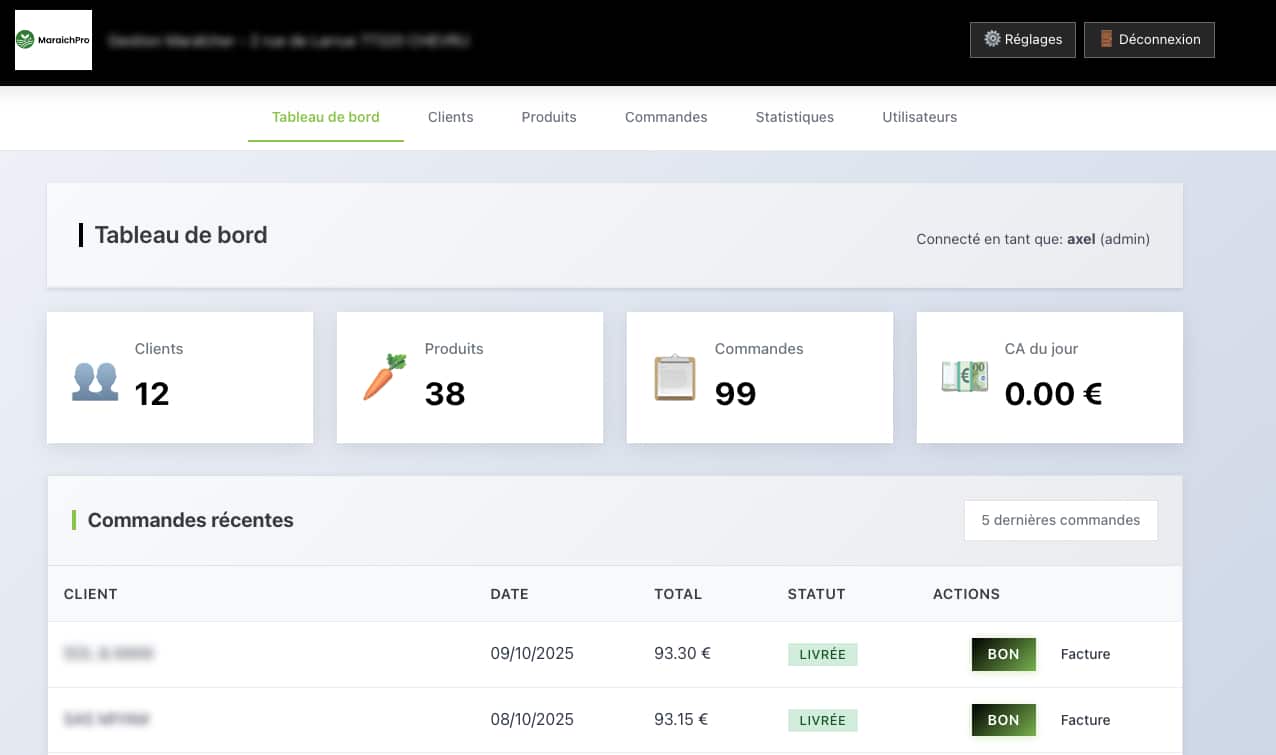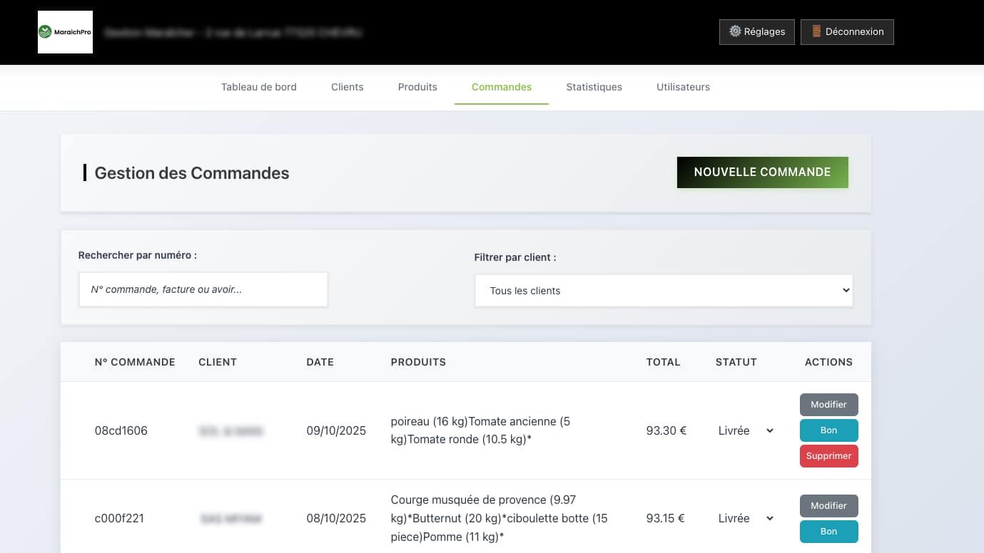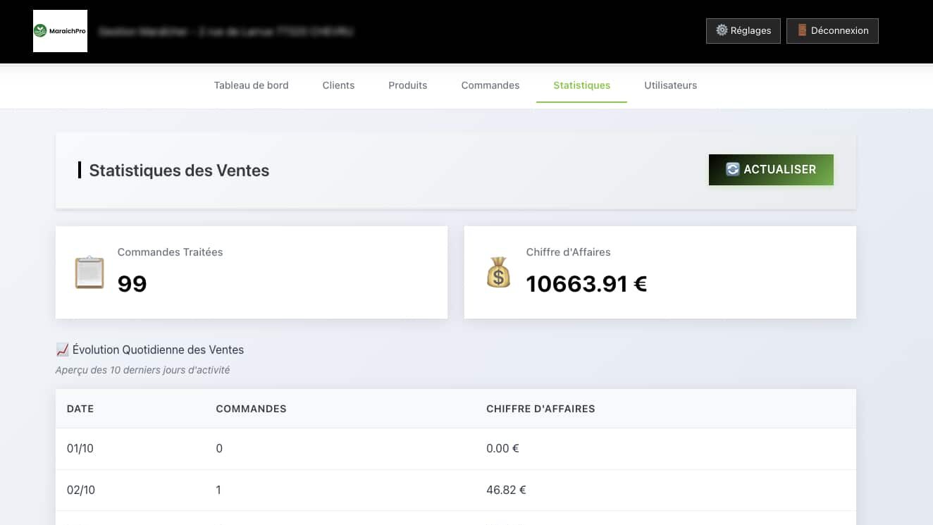 Une interface épurée et efficace pour gérer l’ensemble de l’activité commerciale de votre ferme maraîchère.
